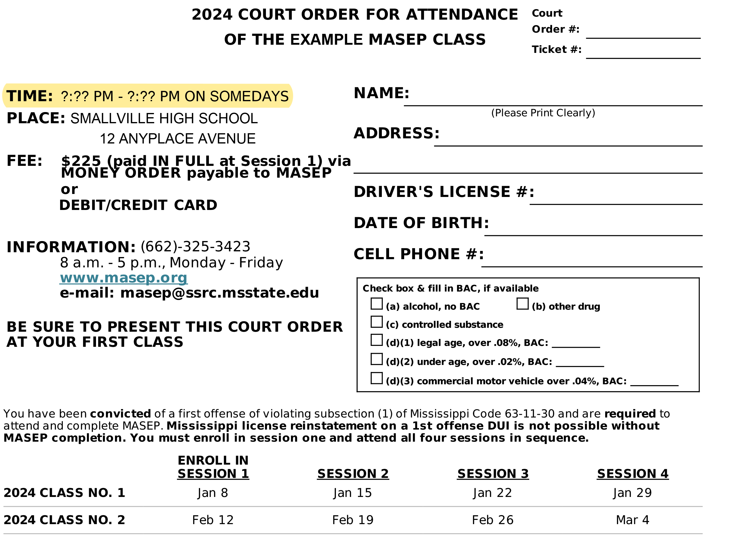 If the individual is licensed with Mississippi and received the 1st offense DUI in Mississippi, he/she must attend MASEP. If the individual is licensed with Mississippi and received the DUI in another state, he/she must contact the MASEP office at 662-325-3423 and REQUEST APPROVAL to take an out of state class. There will be an out of State Processing Fee if you take a class in a different state. After completion of the class he/she must send a copy of his/her program completion certificate to MASEP. The Operations Coordinator will determine if the program attended is a comparable program to MASEP and will approve the out of state program in place of MASEP if it is. We strongly suggest that you also send a copy of your completion certificate to the court that handled your case.